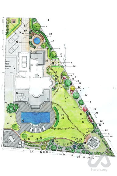 We left an open lawn between the pool area and the bushes and flower beds along the plot border to give a feeling of freedom and generosity of space.