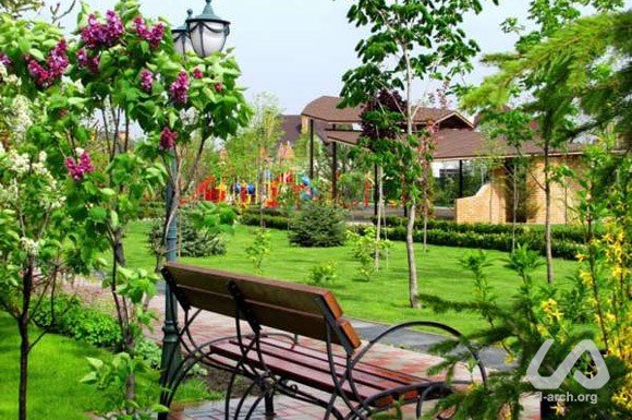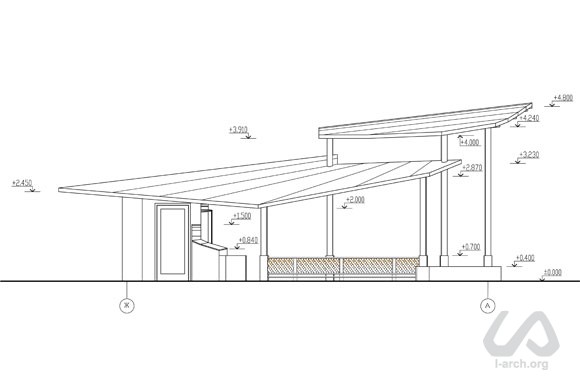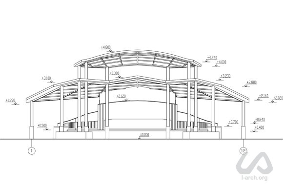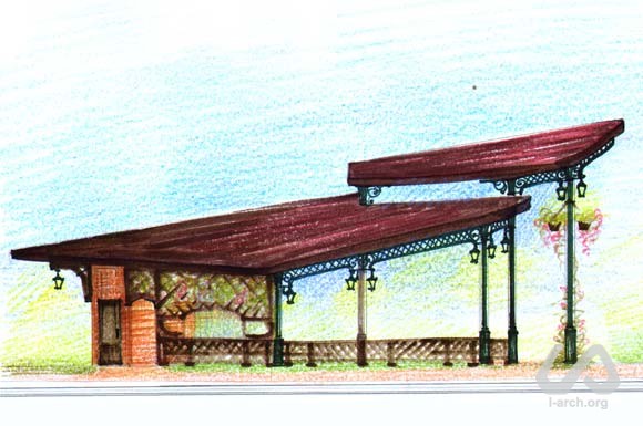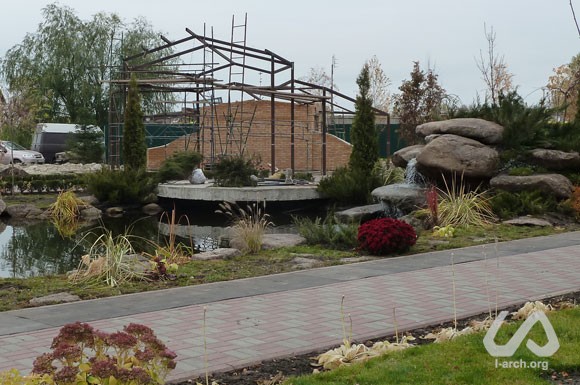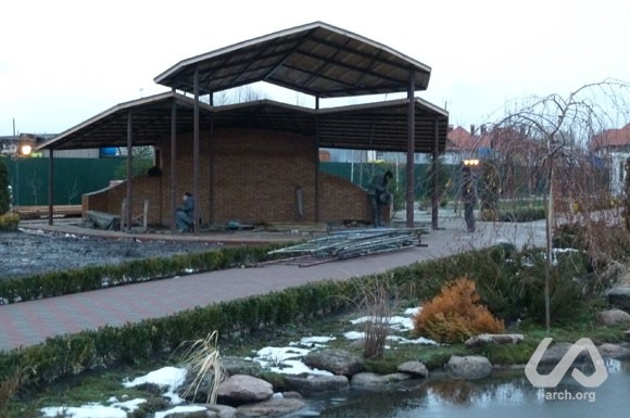 Multifunctional pavillion for relax, games and various activities in the central park of the village of Zoloche, near Kiev. Despite the fact that the park has an axial plan, we turned the structure with a small stage and a panoramic platform towards the lake, in order to create of a certain "relationship" among the different elements of landscaping, which came out to be quite noticeable in the result. As we thought of its shape, we tried to express a gesture of care and shelter. The roof consists of different layers that protect from sun and rain, but let light in. In the back of the pavillion we located a storage for garden tools and public toilets. |