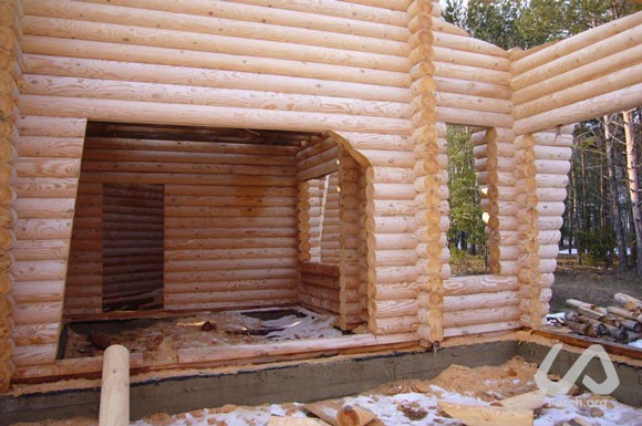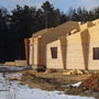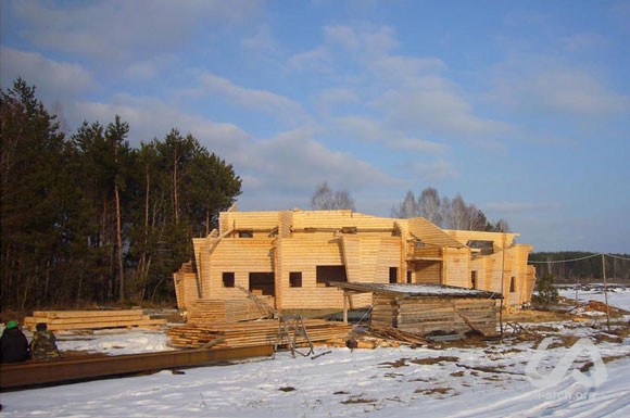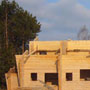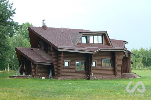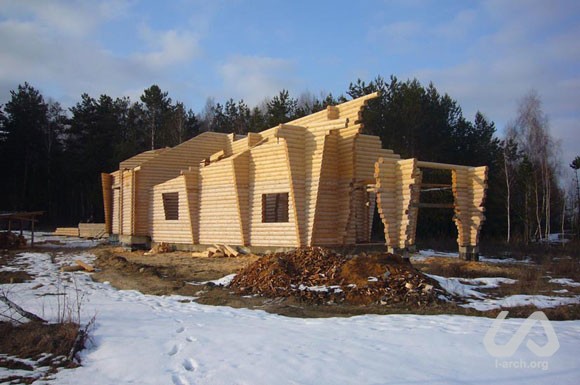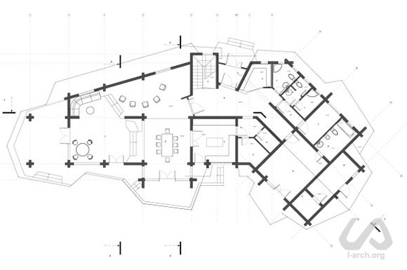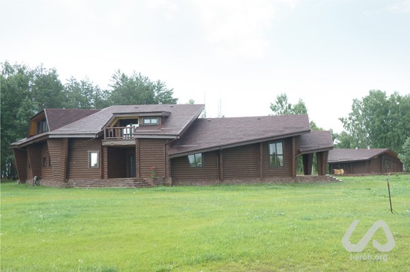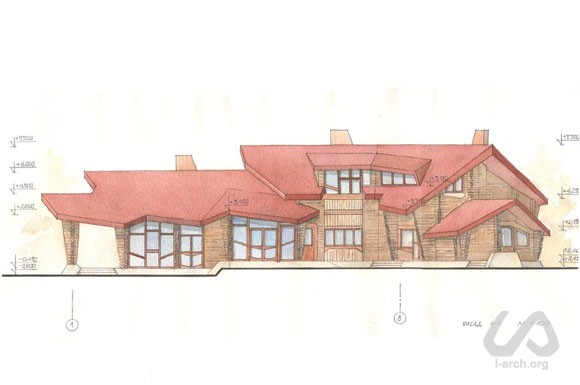 The house stands in a wide-open field and faces a small lake. The shape in plan derives from the adaptation to the presence of the lake and to the will of creating a protected space between the building and the waterside. The architects took on the challenge of designing a moved building in spite of the stiffness of the log construction. According to the personality of the client, the house shows rather strong and sharp forms and a dynamic development from the two-storey part towards the one-storey volume of the living room. The project includes also a house for servants, a sauna, a horse-shed and a covered sitting place. |