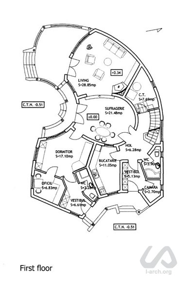 House Muresan Bucharest, Romania The house is located in the suburbs of Bucharest on a narrow site. Therefore its plan develops from the east side facing the street towards the garden located on the south side of the building (left if looking from the entrance side). Through this gesture the house creates a more intimate atmosphere in the garden and protects it from the neighbours and from the street. The gesture of the building also reflects the shy and delicate personality of the lady who owns the house, but it also adds a new quality of movement and individual dynamic which should suggest a possible development of the introverted character. The rooms in the house also respond to the inner needs and wishes of the owner, with a protective and embracing oval dining area in the center of the building and a double-height living room opening onto a covered terrace on the garden side. |