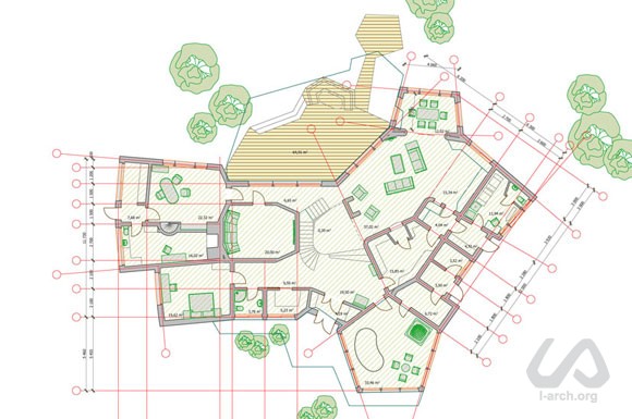 The main, difficult task was to satisfy two very different personalities (husband and wife) with one design solution. The husband wanted a house surrounded by a Japanese garden with a large, beautiful pond and a lot of original Japanese plants. It was also important to provide a large study room, a home theatre, and to take into consideration the owner’s love for fishing, hunting and home-cooked cuisine, for which a Russian stove was required. For the houselady it was important to have a terrace for sunbathing and large stained-glass windows typical of modern houses. The main challenge was to combine all these wishes and give the customers the feeling that this is their home. |