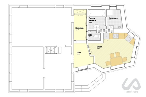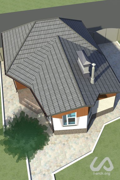 This house is located in the private sector of Chernihiv. Its owners decided to add to the existing good-quality wooden building a kitchen and dining area, projecting towards the garden. The new volume organizes a pleasant courtyard entrance to the house and gives life to the static nature of the old building. Since the new part was planned in masonry, the elevations have been partly covered in wood, in order to connect old and new without conceiling the difference between them. |