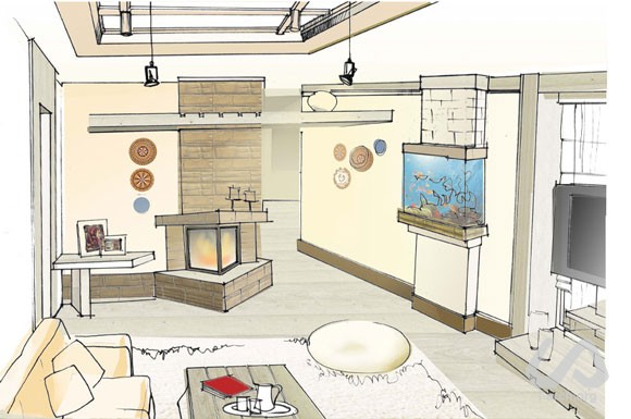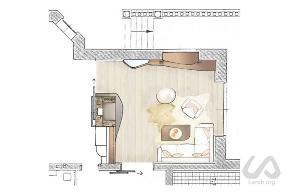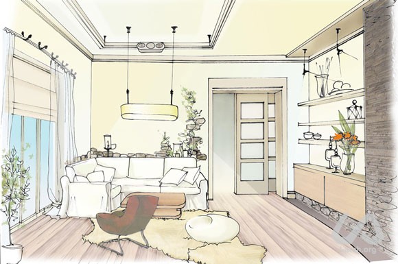 A young family wanted to live in the village of Zoloche in a two-storey house with a light and warm atmosphere, which should be achieved by using materials that are typical for suburban housing, such as wood, stone, light plaster, pleasant textiles. The clients also wished to have a fireplace and a big aquarium. One of the main questions to define the design solution was the choice between giving priority to the TV-set or to the beautiful view out of the windows in positioning the couch and the licing room's furniture. |