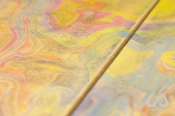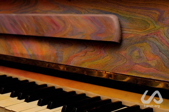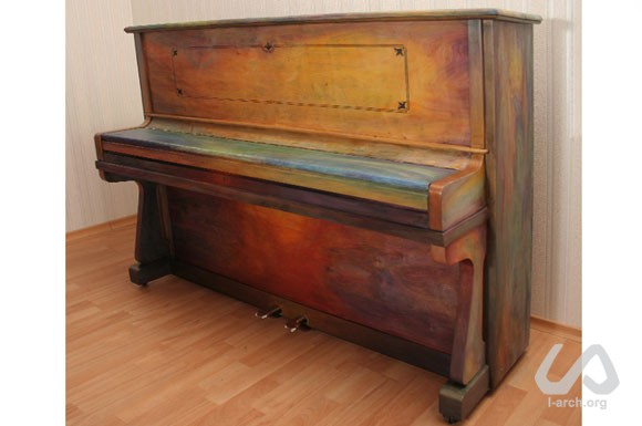 In front of the group was a black piano, an instrument that emits music and creates new worlds. Why should it be black? Is it possible to bring the instrument closer to its essence, to the essence of the music and to its sounds? But what is the instrument in itself? Where is the heart of a piano? How does the sound spread? How do the impulses of music proceed from the pianist to the listener? Colour has a deep connection with music and it can express tone, timbre, rhythm, melody in different ways. We chose to use colour as an expression of the sound and of the energetic waves spreading from an instrument. Colour as an expression of impulses that stimulate the person to creativity, to touch the keys, and incite him to freeing the music from the instrument. We were solving on practice a rather complicated task – how to express music in colour. We decided not to add anything decorative and artificial - for example patterns or sceneries. The pattern of the wood fibers seemed to us corresponding to our idea about musical flowing. In the lower part of the instrument, under the keyboard, we tried to show the impulse which leads to the wish of playing. It is a wish of music to sound. This wish, as the motivation of the pianist to play, increases and flows upwards. On the level where the hands of the player touch the keys - in the moment when he is ready to play – the impulse is turning into action. At a certain point the sound arises form the hammers and starts to spread all around. This is shown in the streams of colours on the wooden surface above the keyboard, whereas the quality related to the creation of the melody appears on the sides and on top of the piano. |