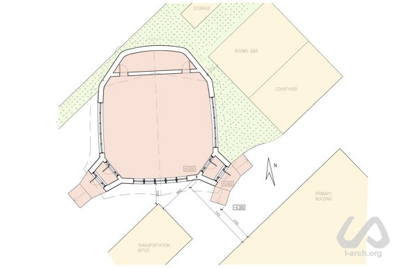 Дуже незвичайне і цікаве пропозиція надійшла до нас від Керівництво Печерської школи. Вирішено було побудувати місткий багатофункціональний павільйон для театральних вистав, концертів, шкільних зборів, а також, щоб показати дітям з різних країн процес будівництва з натуральних, традиційних природних матеріалів, які можна легко утилізувати, з мінімальною шкодою для екології. Вирішуючи задачу, потрібно було вписати нову будівлю в існуючу середу і зберегти комфортну ситуацію і сформовані зв'язки між корпусами школи. В якості конструктивного рішення був обраний дерев'яний каркас і солом'яне заповнення, з подальшою вапняної штукатуркою. Всередині - часткове штукатурне покриття і дерев'яна обшивка на рівні дитини, для можливості організувати експозиції дитячих малюнків і фотографій. |